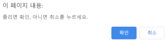<p>확인 버튼과 취소 버튼이 나타나며, 확인 버튼을 클릭했을 때 true, 취소 버튼을 클릭했을 때 false를 리턴한다.</p>